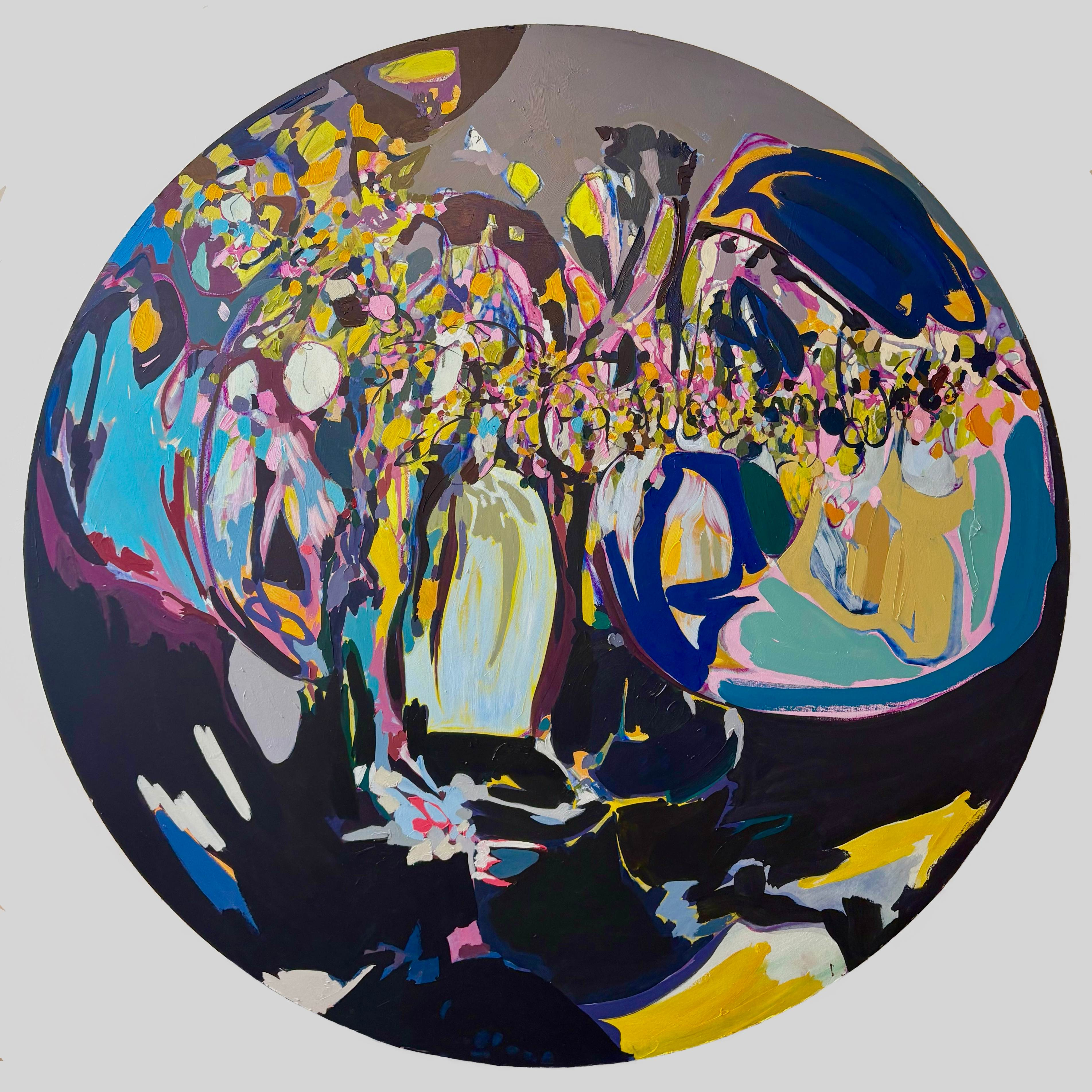 This circular piece represents cycles, wholeness and the interconnectedness of life. Challenging static conceptions, this painting resists resolve by acting as a lens that explores the intersection between the horizons of shared human perception and the endless possibilities of imagination.