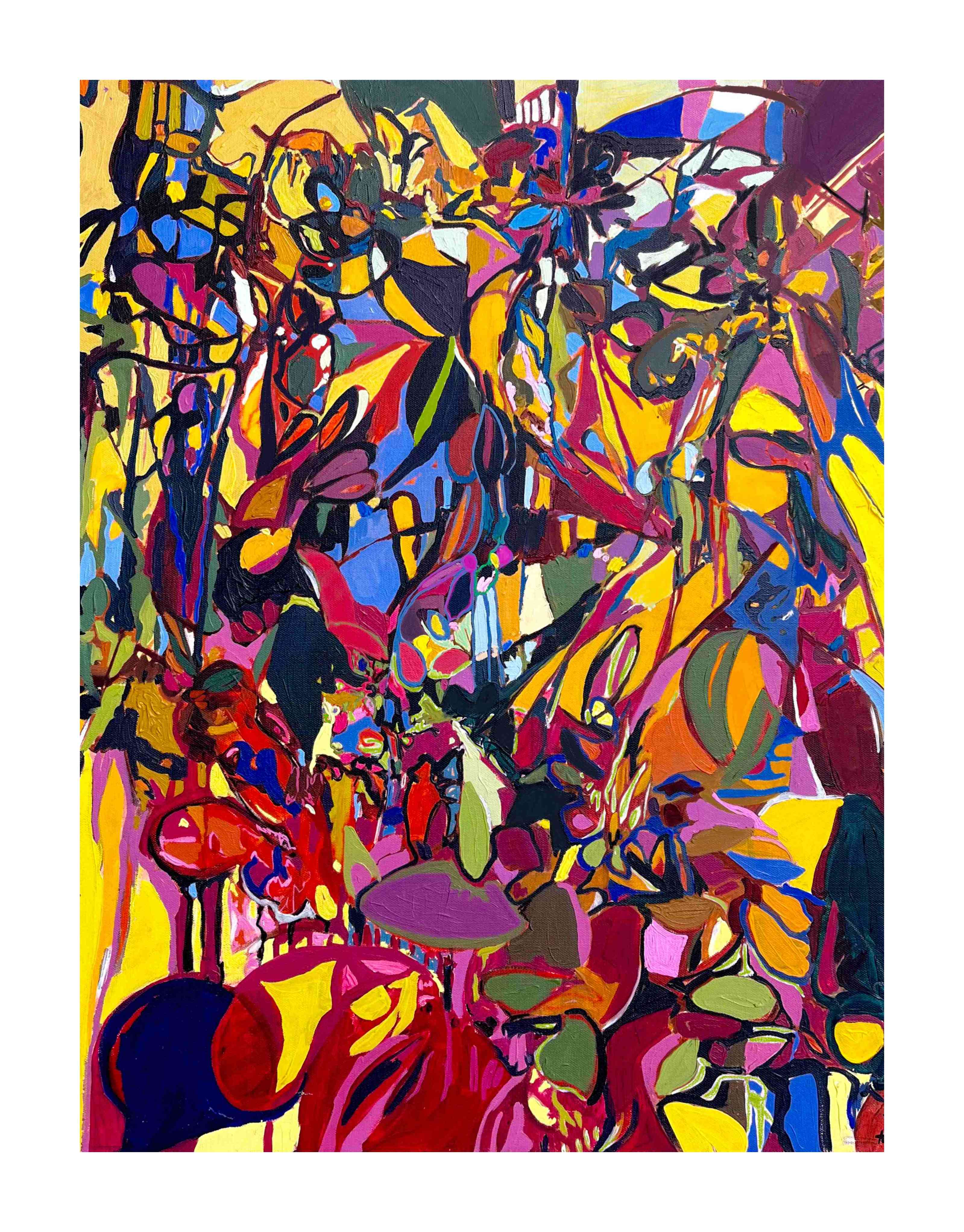 In painting, her dynamic and intuitive process is an inquiry into the rhizomatic threads of connection that humans share with nature. The outcome resists the illusion of understanding, favouring suggestion instead. Her practice begins with drawing natural forms that unfurl onto the page, which she rotates as she works, allowing each composition to evolve without a fixed orientation. Her works exist in a continual state of becoming, acting as portals into transformation that invite viewers to open their minds and shift their perspective.