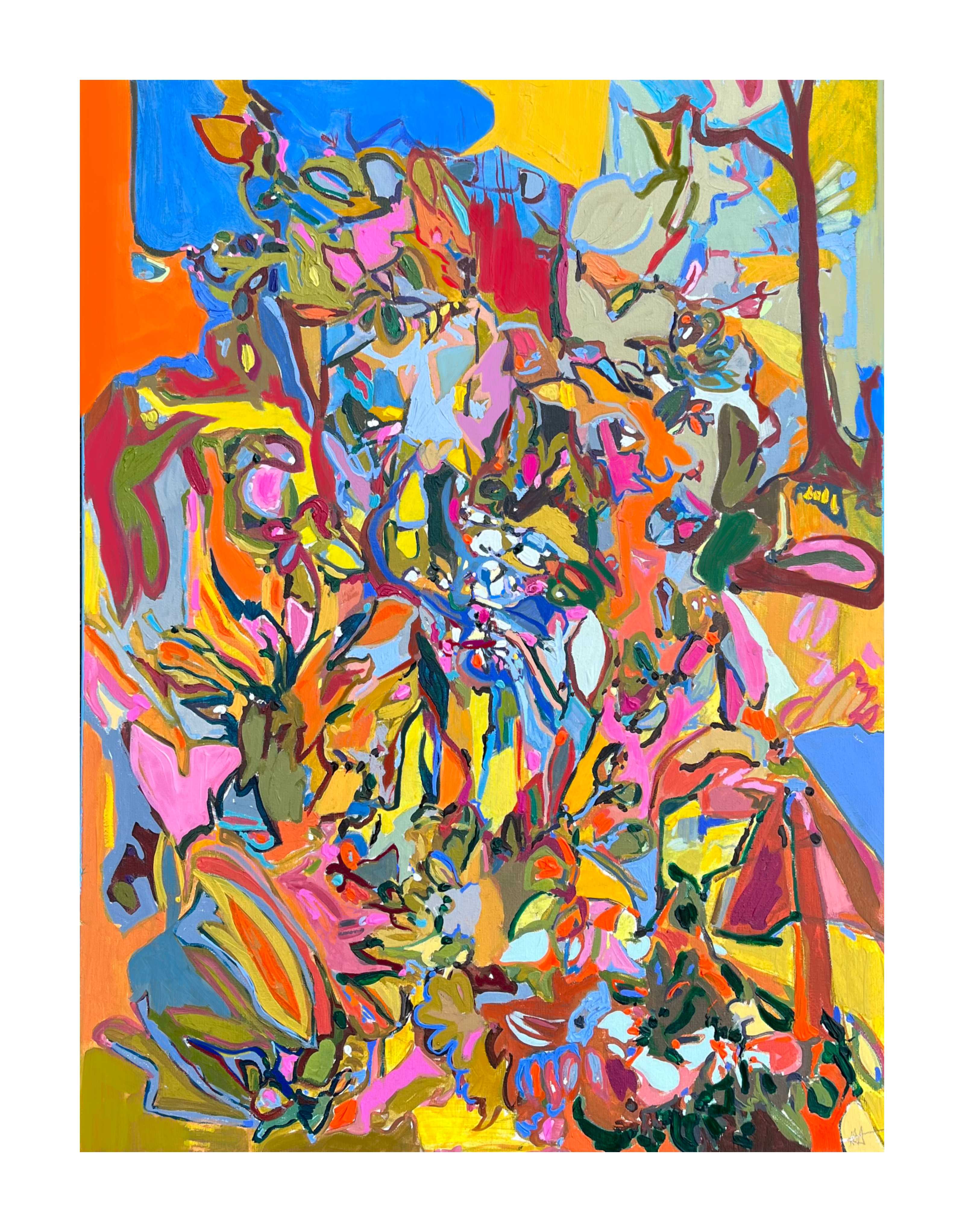 Following a layering regime of thick oil paint over a base layer of thinned acrylic paint, this painting was made while submerged in the woods and surrounded by trees. Bold , abstract shapes flirt with figuration. While organic forms, twist and bloom, creating a sense of momentum and flux.