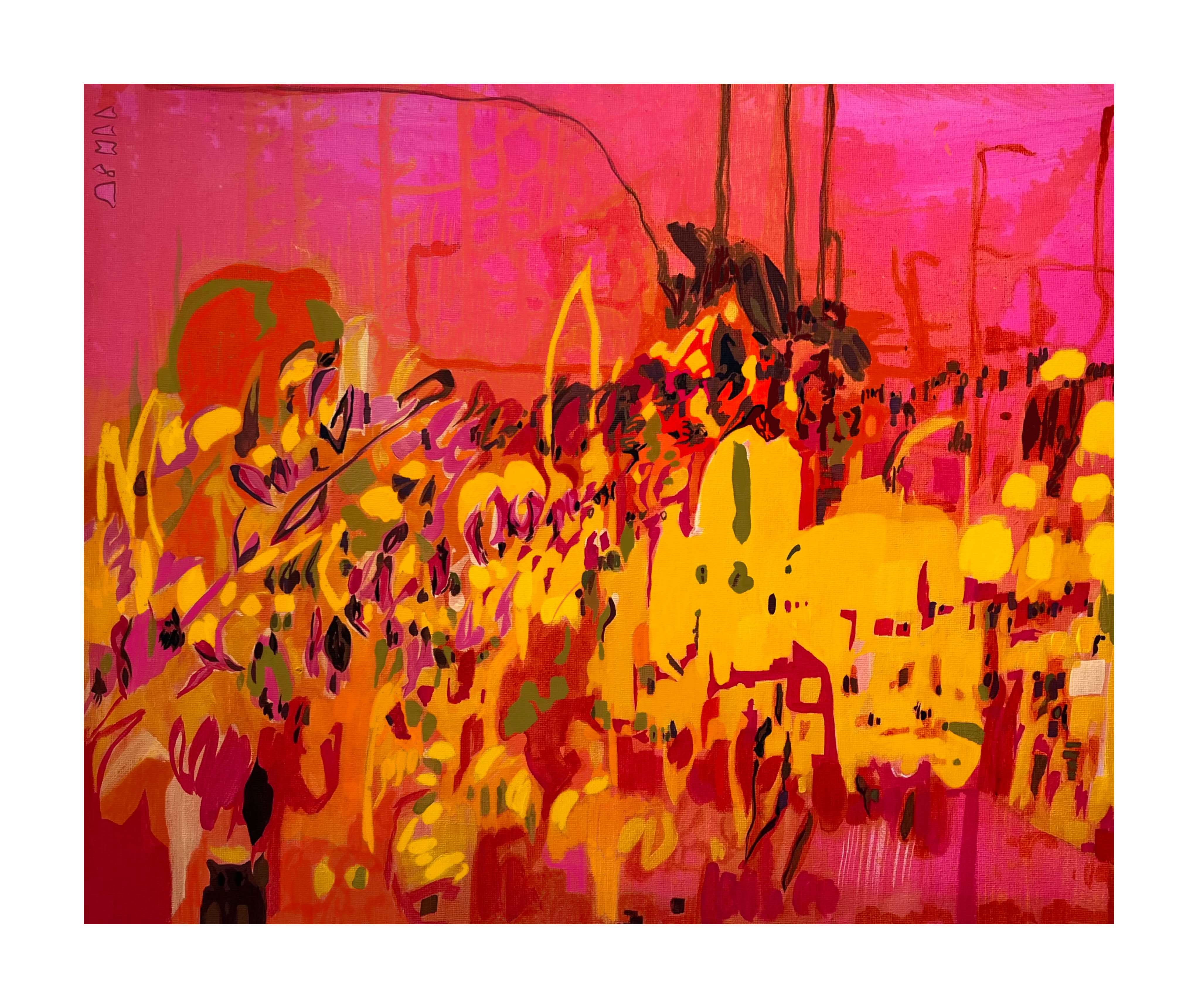 In painting, her dynamic and intuitive process is an inquiry into the rhizomatic threads of connection that humans share with nature. The outcome resists the illusion of understanding, favouring suggestion instead. Her practice begins with drawing natural forms that unfurl onto the page, which she rotates as she works, allowing each composition to evolve without a fixed orientation. Her works exist in a continual state of becoming, acting as portals into transformation that invite viewers to open their minds and shift their perspective.