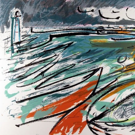 “This screen-print was made in exactly the same way my sketchbook pages are built up; drawing and painting outside and observing the subject throughout the day- watching the light change. I aim to capture the drama and force of these changeable elements at sea. Sheets of large drafting film were placed directly on the sand in front of me as I captured with crayons and washes, layer by layer, the tide coming in and surrounding the lighthouse. I have a strong connection with the West Coast of France where my parents live on an Island and I have been brought up on boats my whole life sailing with them. Many hours have been spent walking around the Island with my sketchbooks in winter and summer. It is important that spontaneous sketches, on the spot, merge into the large finished works and embody that spirit and liveliness.” – Lucy Farley