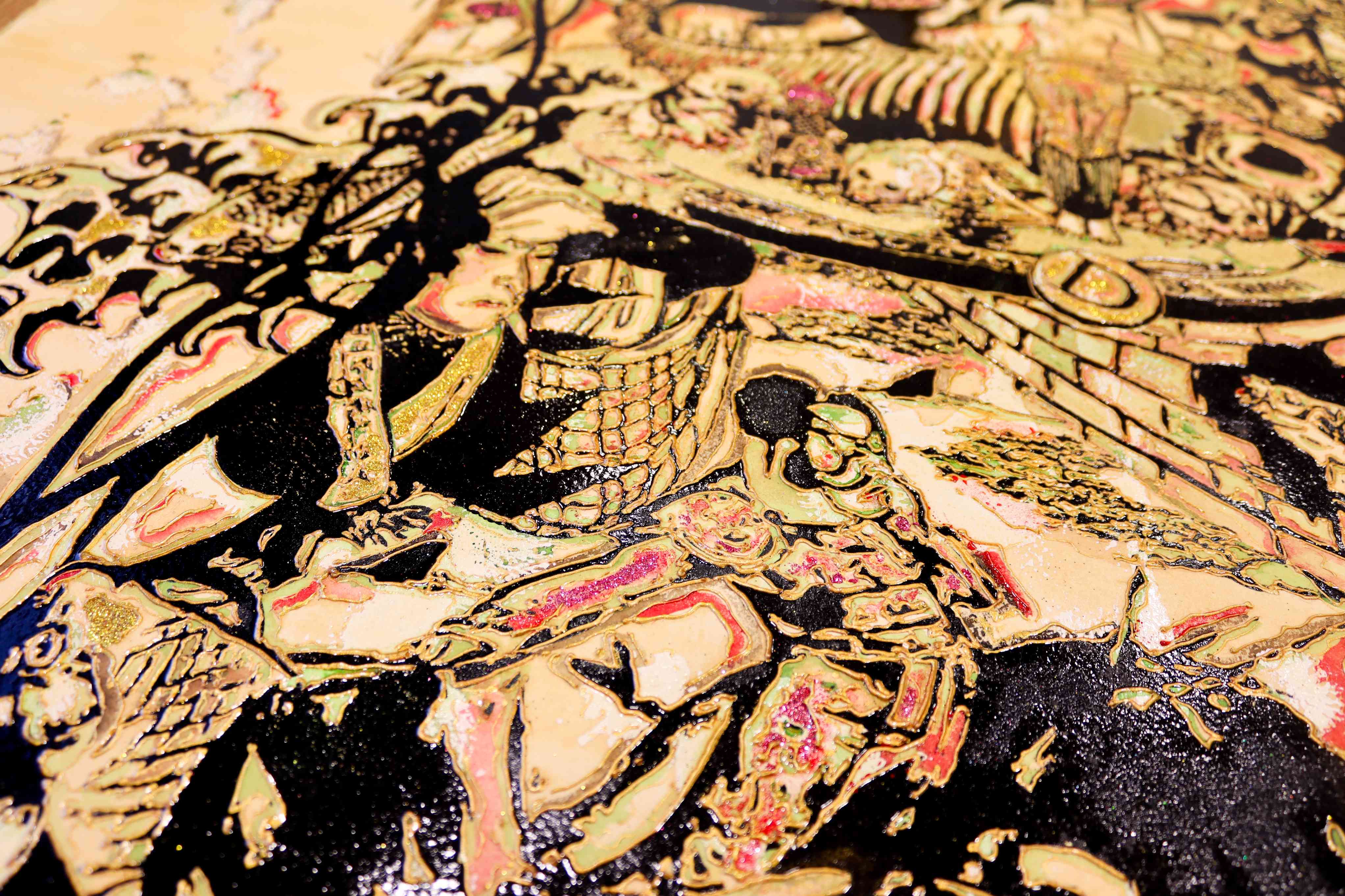 Elements within the piece represent cryptocurrency terminology, such as a bull market, signifying rising prices. Characters like Man Wearing a Dog Mask Fishing for Dogecoin and Trollbox reflect the playful and social aspects of the crypto world, while works such as Fishing Bait, Inflation and Cryptocurrency Addiction examine the psychological and economic dimensions of the subject.