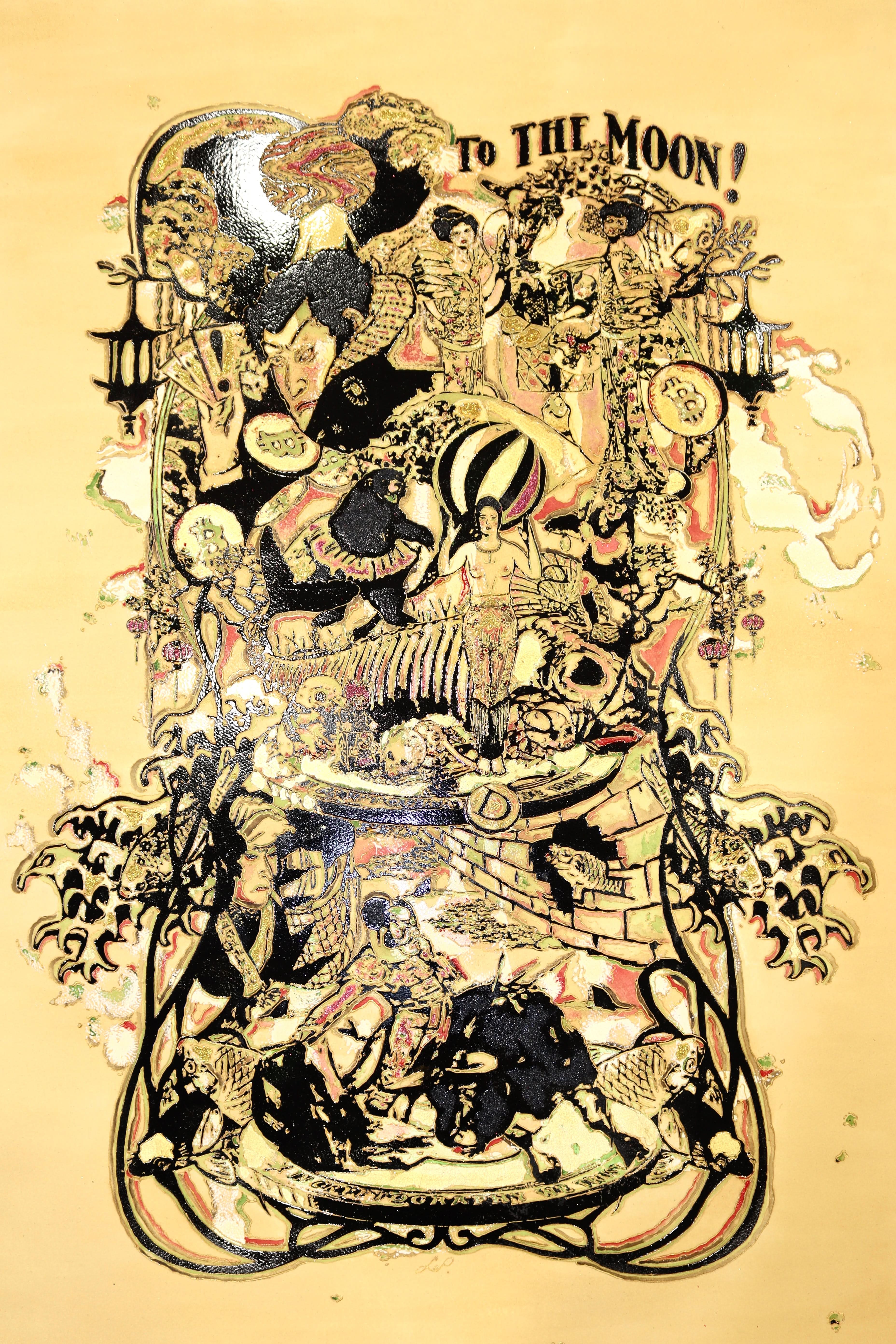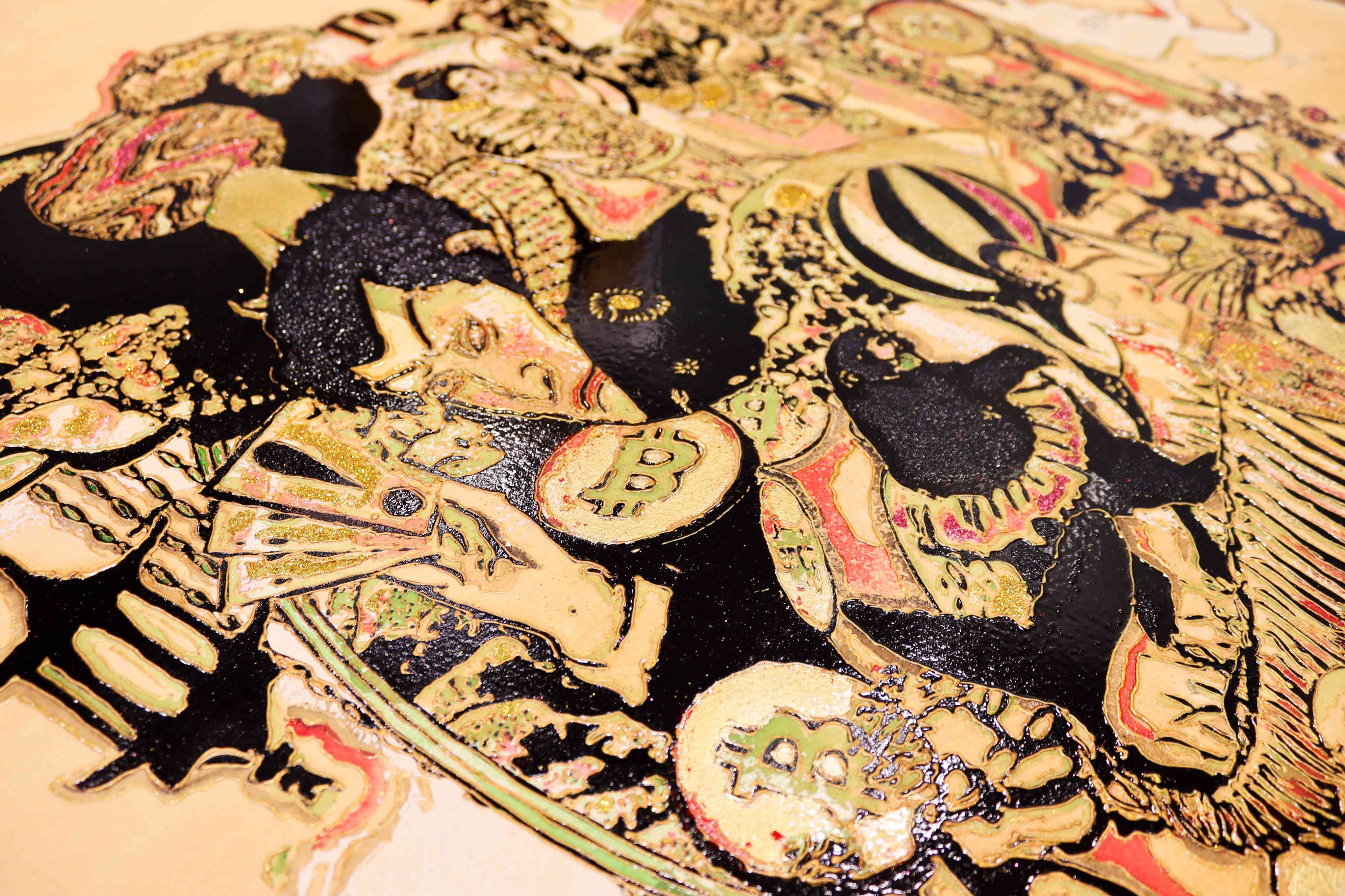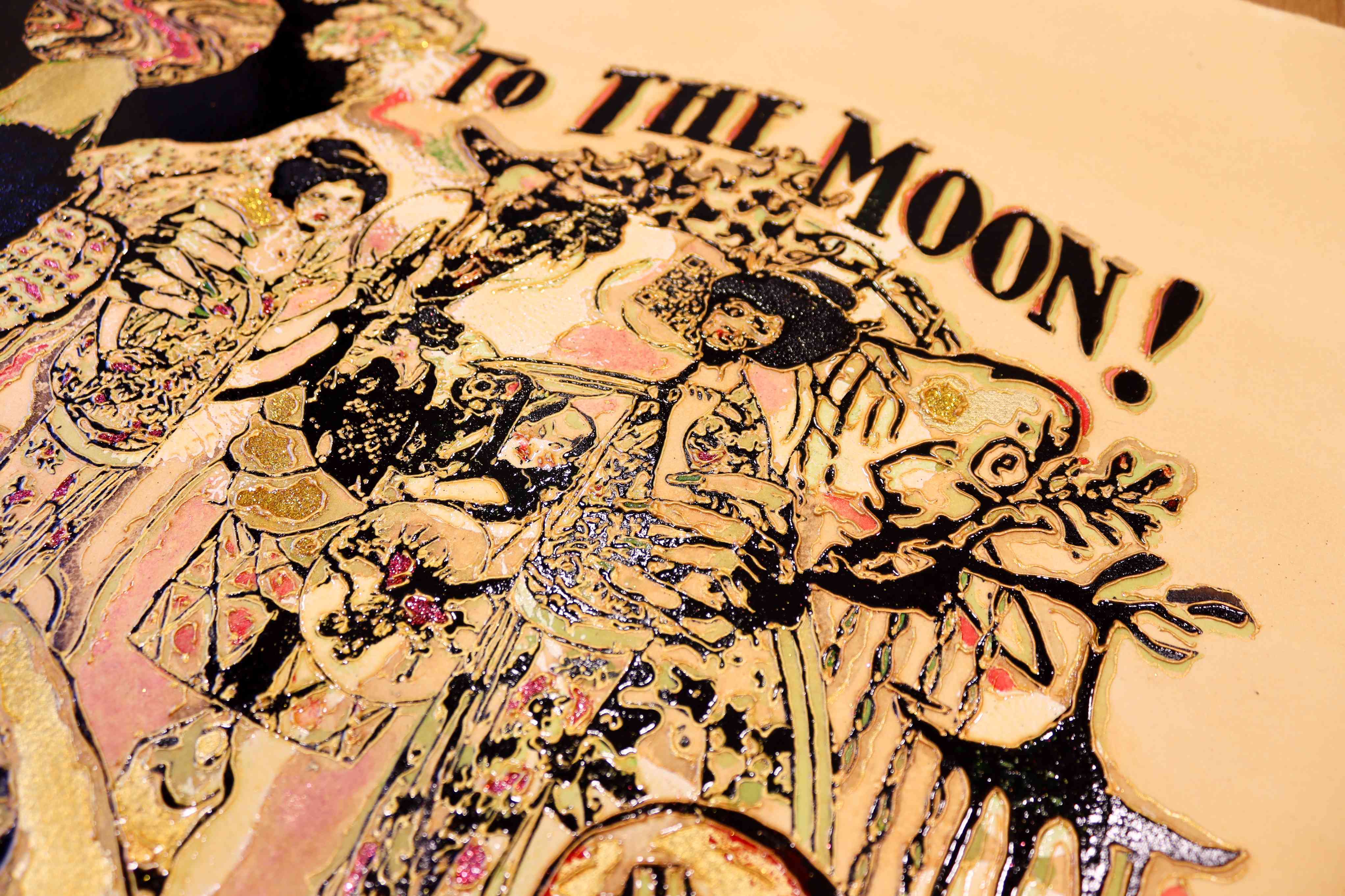 This piece specifically celebrates the phrase To the Moon!, often exclaimed by crypto traders during price surges. The artwork also explores the enigmatic origins of Bitcoin and its creator, Satoshi Nakamoto.