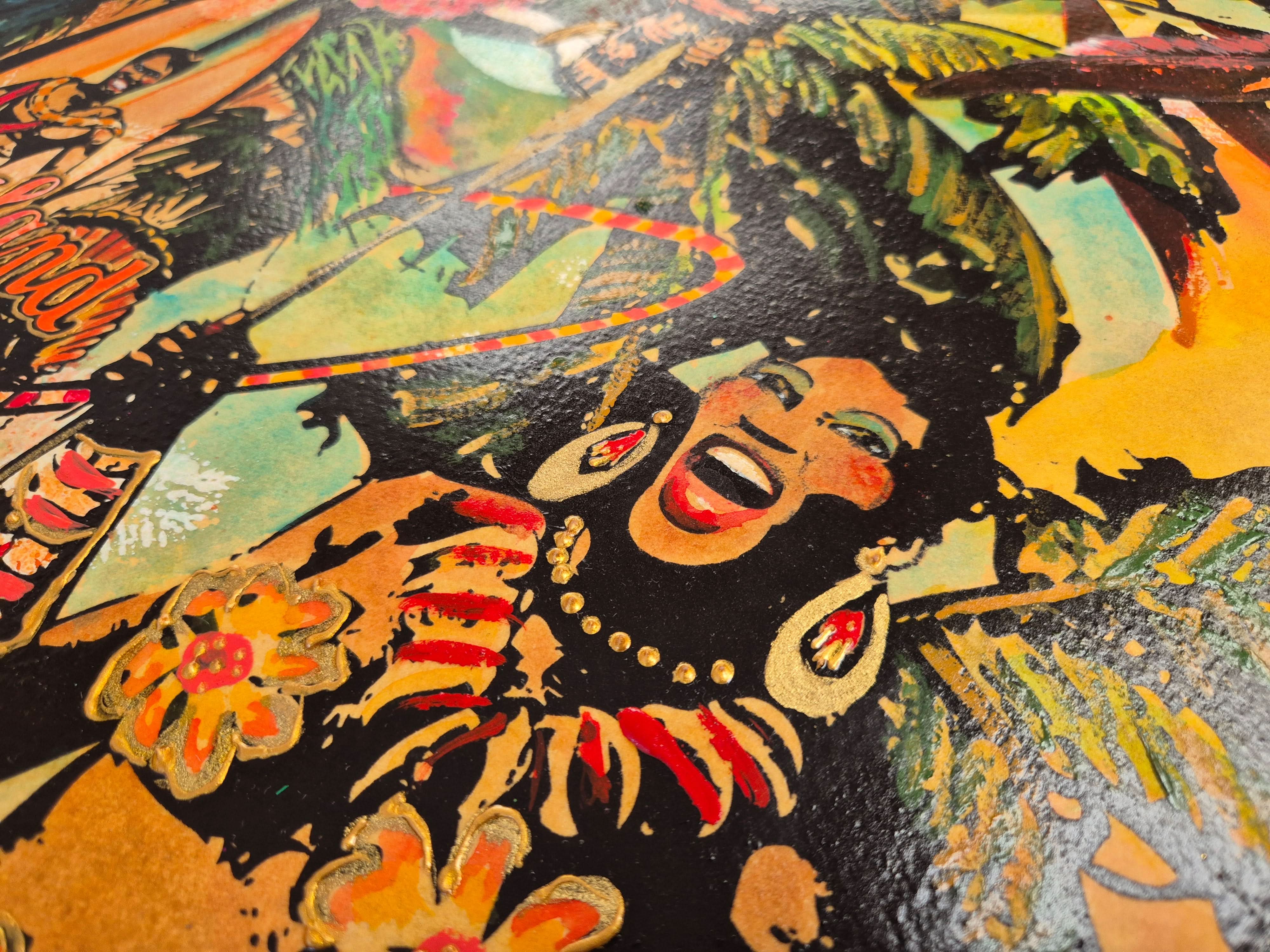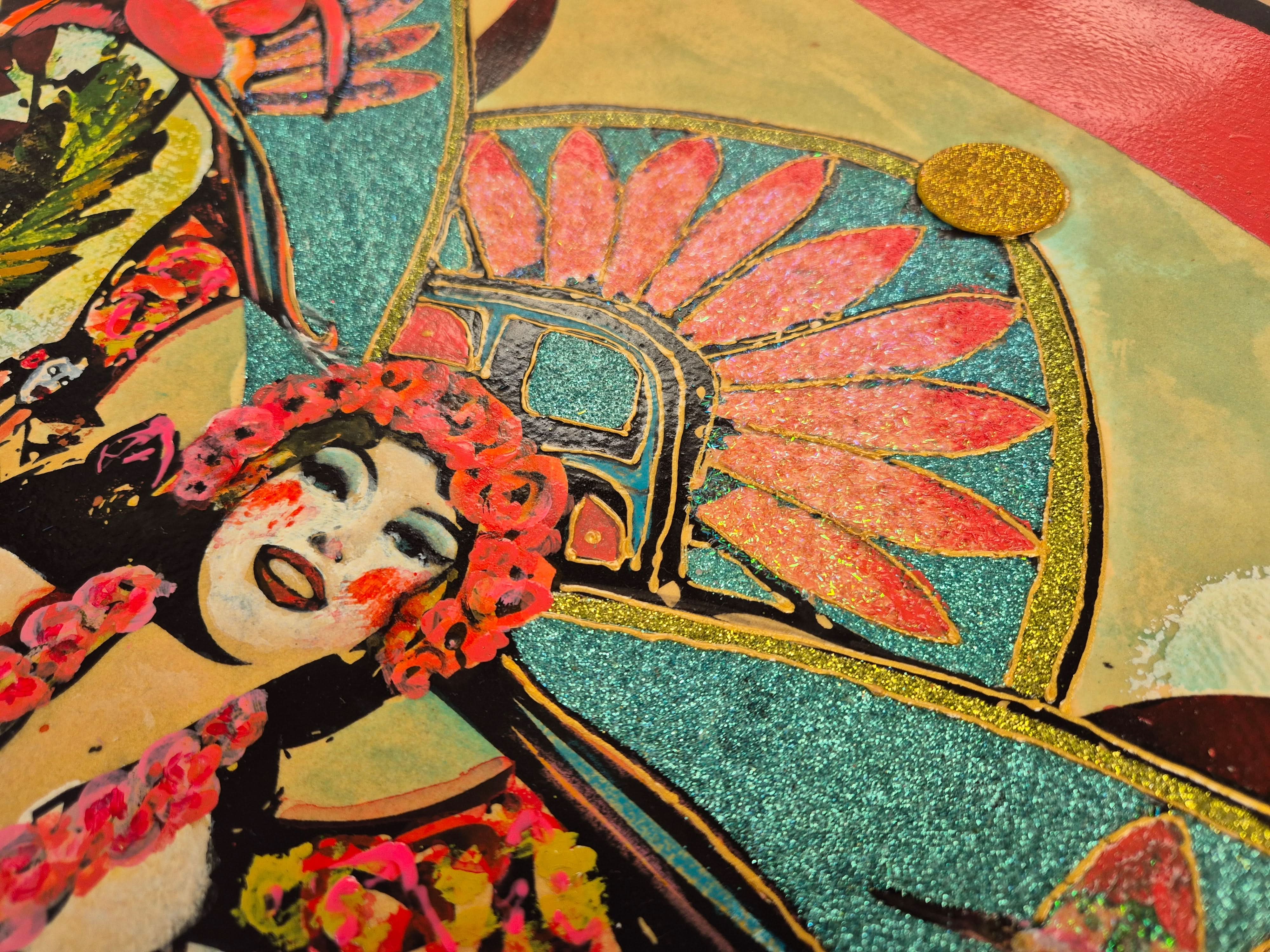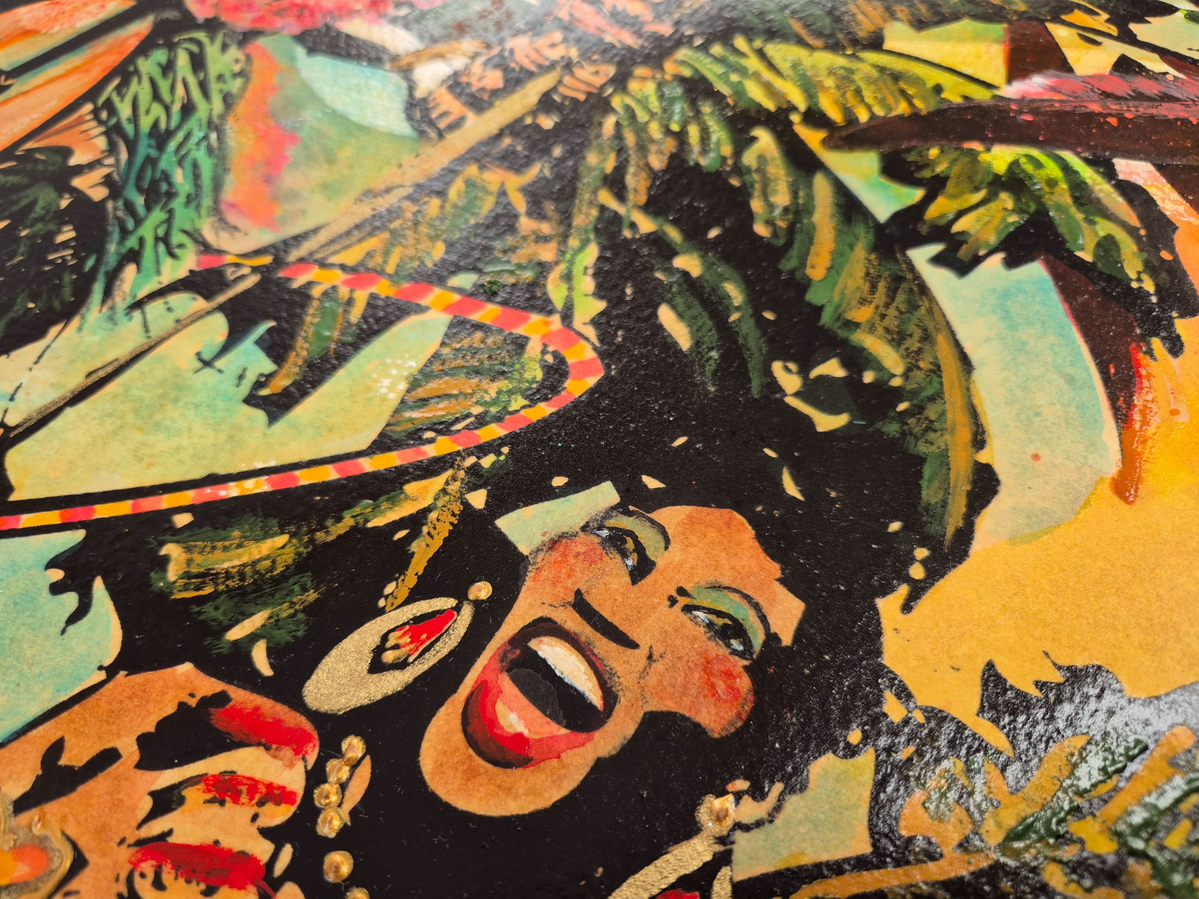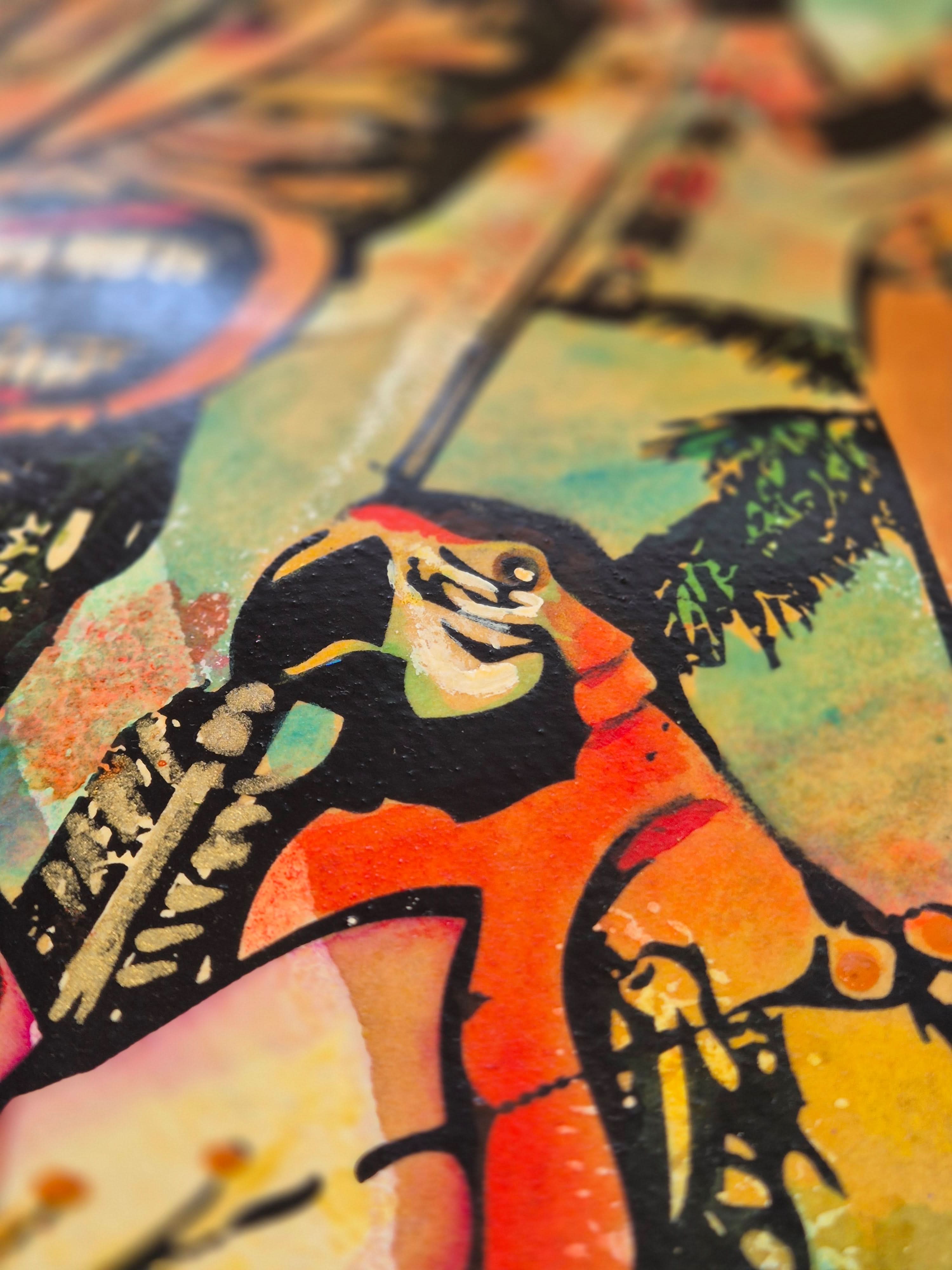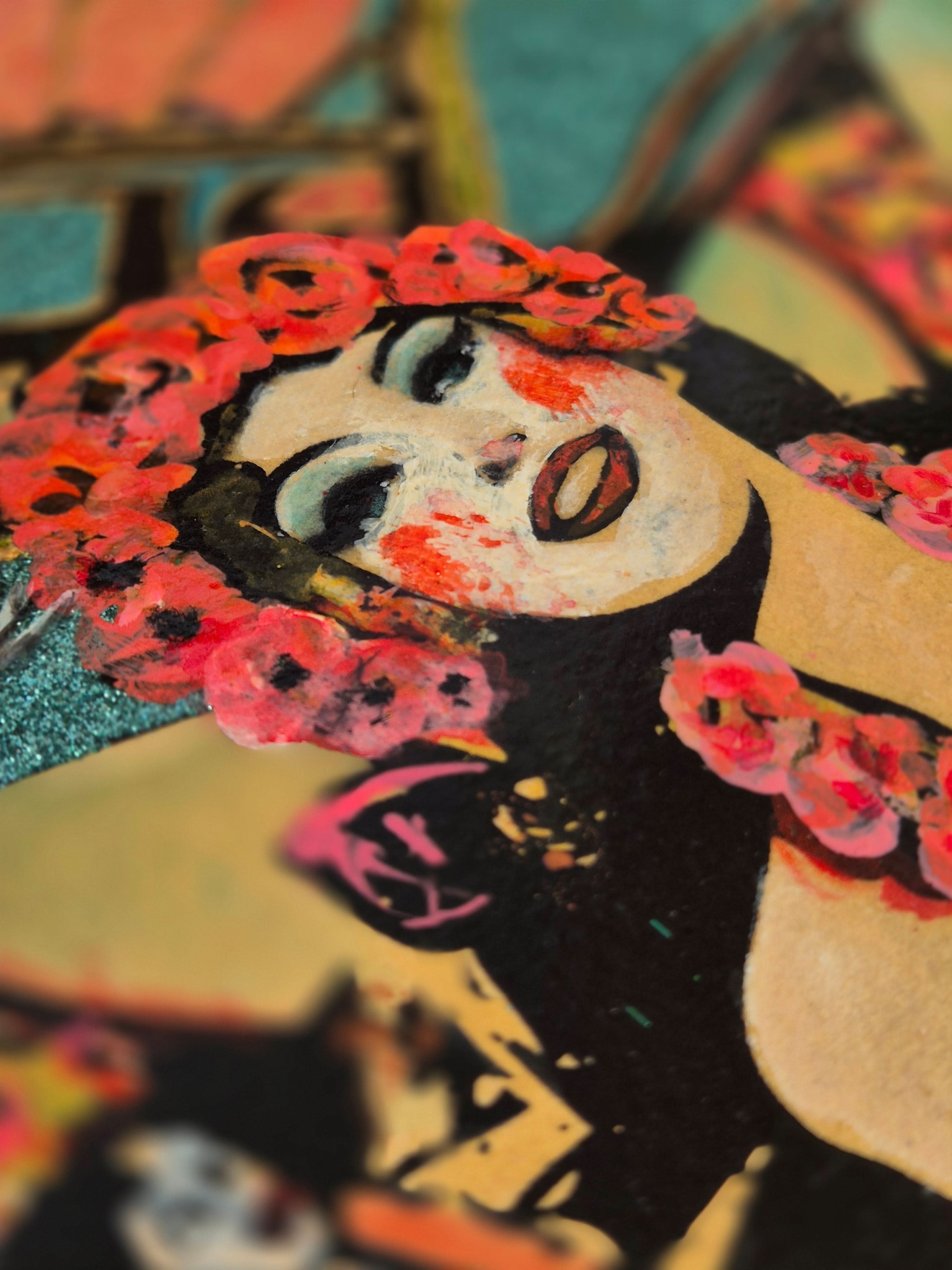 Lidia de Pedro’s Wonderland is a dazzling, richly layered work that tackles the politics of power, movement, and belonging. Created using a mesmerising mix of acrylics, inks, watercolours and glitter, this large-scale original combines Lidia’s signature symbolic style with sharp social commentary.
