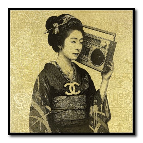 BoomBox & Bling presents a bold fusion of tradition and modernity. The piece depicts a geisha adorned with a Chanel emblem alongside a vintage boombox, set against a sumptuous gold backdrop. It explores the intersection of cultural heritage and contemporary style, forging a striking dialogue between past and present.