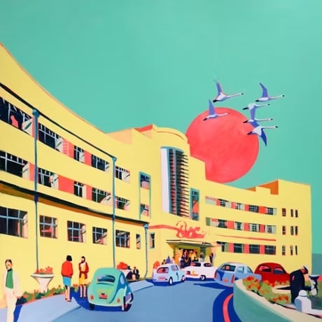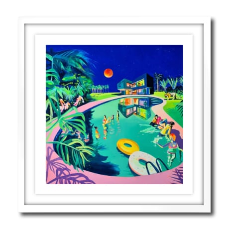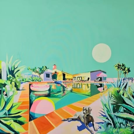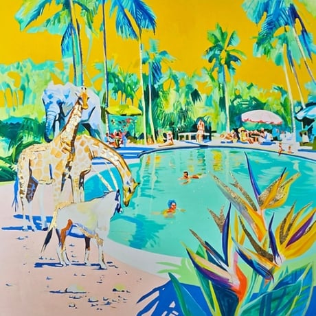 A graduate of the Glasgow School of Art, with additional training at Beaux-Arts de Paris, Mulvie’s work is rooted in memory and imagination. She paints sun-drenched lidos, retro hotels and lush, otherworldly scenes that blend the real with the surreal, often punctuated by personal symbolism and playful eccentricity.