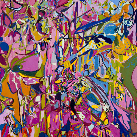 In painting, her dynamic and intuitive process is an inquiry into the rhizomatic threads of connection that humans share with nature. The outcome resists the illusion of understanding, favouring suggestion instead. Her practice begins with drawing natural forms that unfurl onto the page, which she rotates as she works, allowing each composition to evolve without a fixed orientation. Her works exist in a continual state of becoming, acting as portals into transformation that invite viewers to open their minds and shift their perspective.