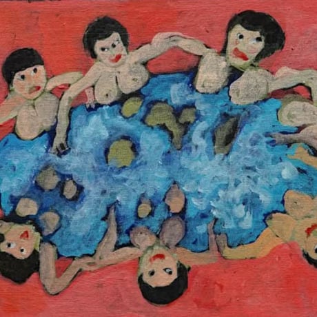 This vibrant and playful artwork features six stylised figures holding hands in a circular formation, surrounding an abstract pool of cool blue and green tones. Set against a striking red background, the piece radiates energy, connection, and movement.
