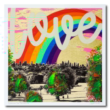 Using his innovative printmaking practice, which combines silkscreen with painting and collage techniques, the artist recreates iconic views of cities, playing with colour and perspective in the process.