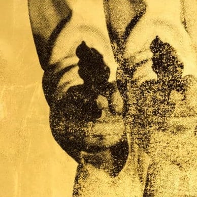 Double Silver Pop Gun is from a set, rendered in the colour of bullets. Straight out of a gangster film, the artwork depicts a gun being pointed at the viewer, doubled like the double barrel of the weapon itself.