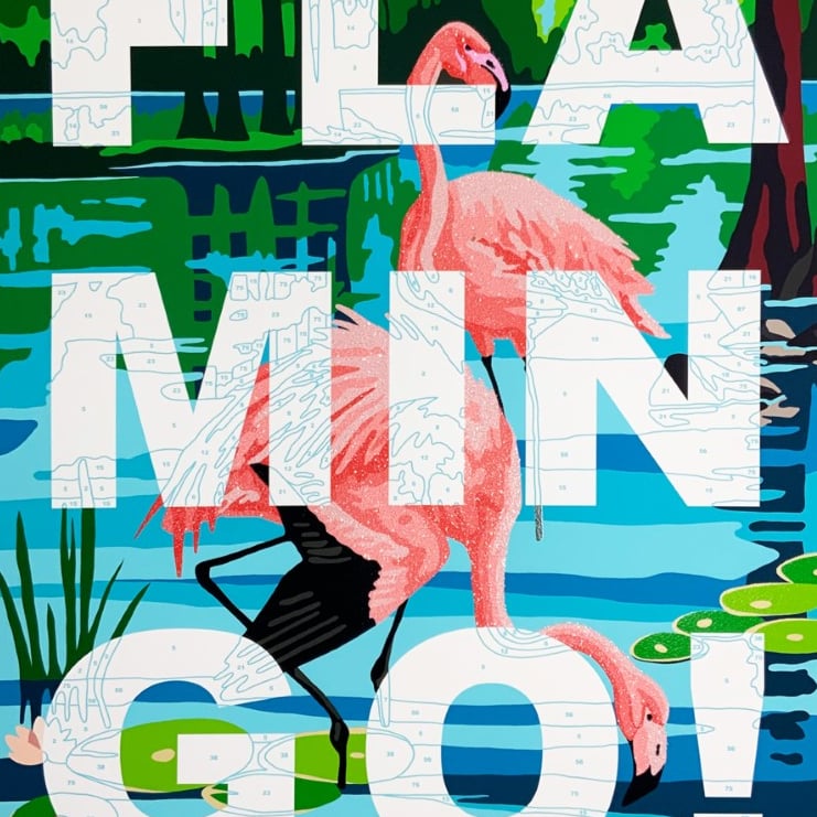 Flamingo! 2 depicts a tropical landscape with palm trees, shallow water and a flamboyance of flamingos, balancing against a pale blue sky. Over the vista, the title 'Flamingo!' is superimposed in big block letters, gently laced with a soft, blue, 'Paint by Numbers' pattern. Bright and poppy, the print subverts the picture postcard, both offering and withholding a tantalising space within.