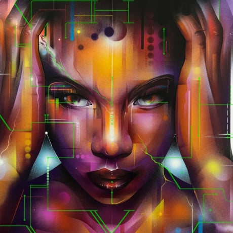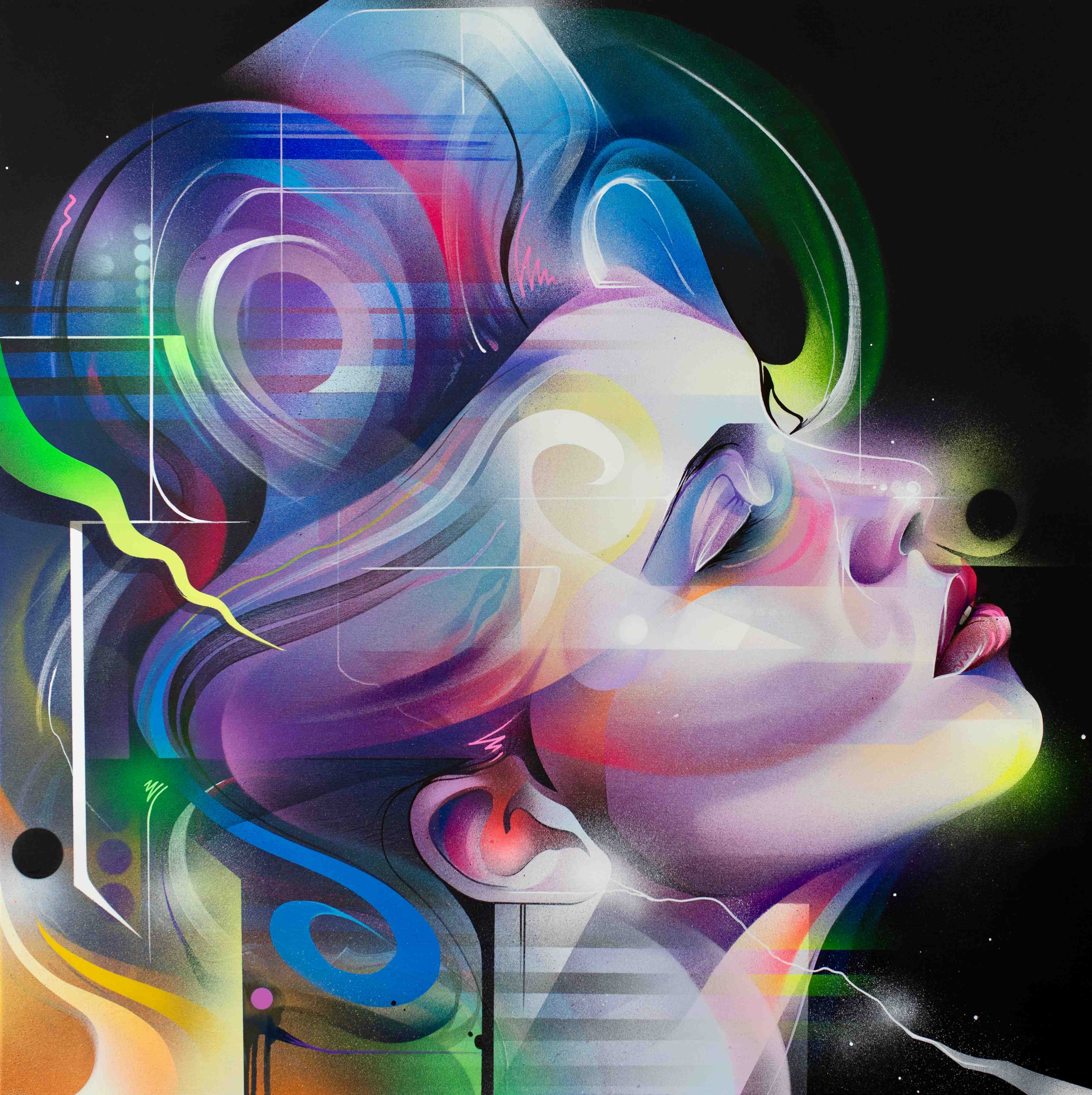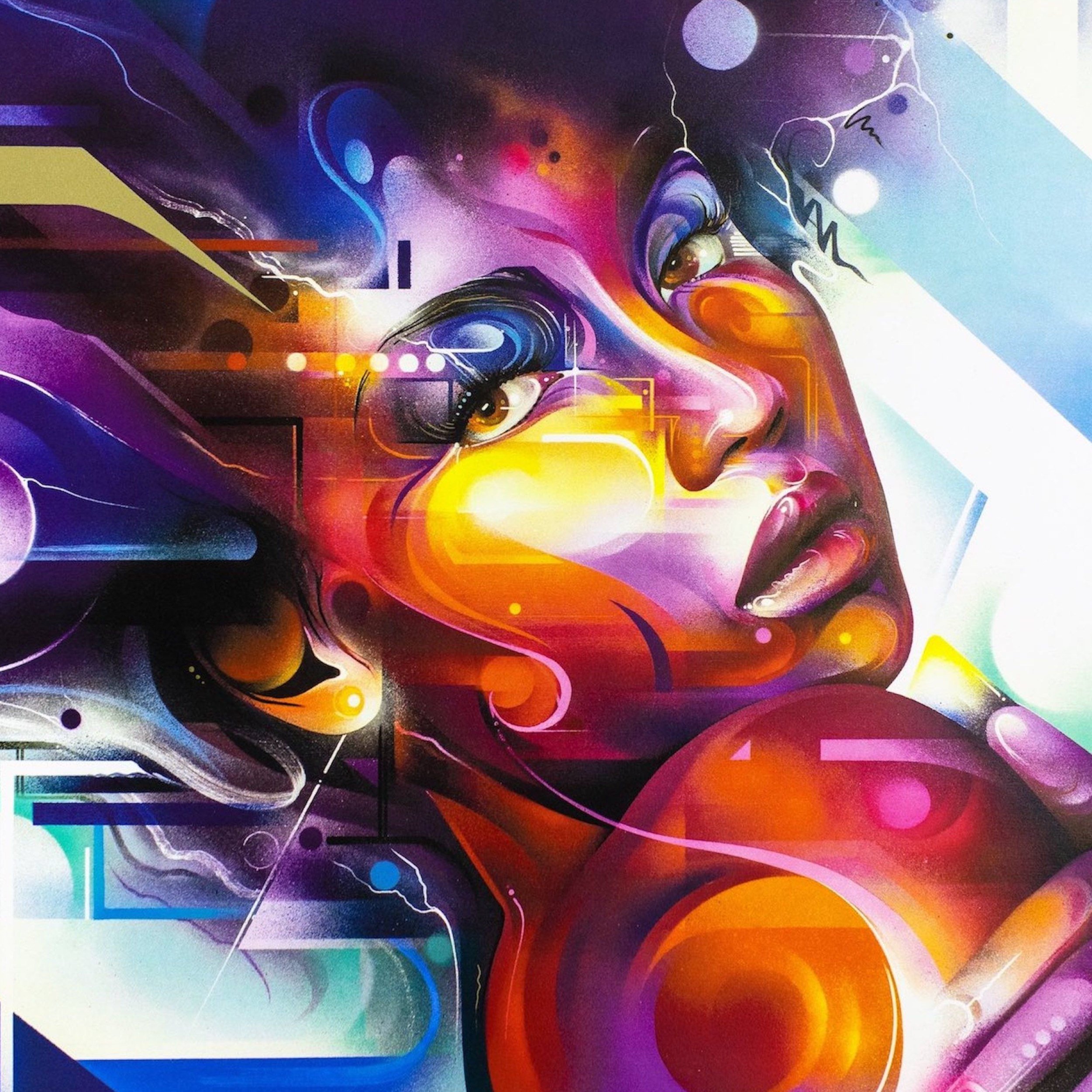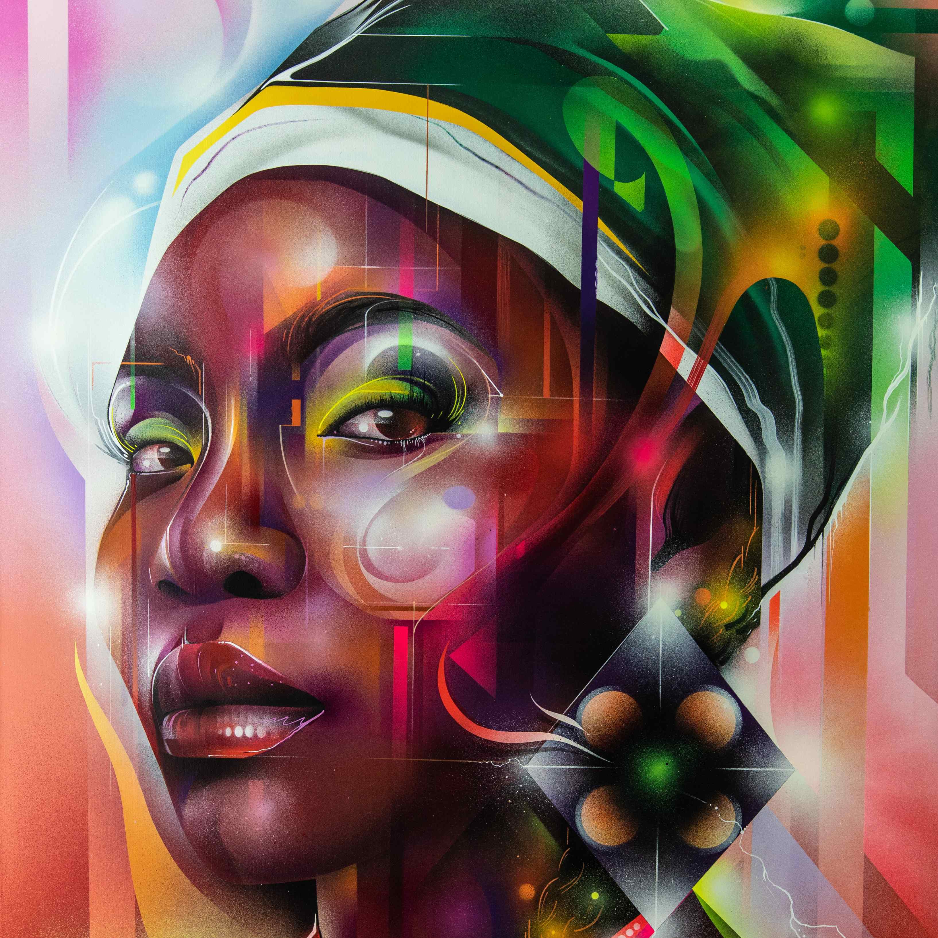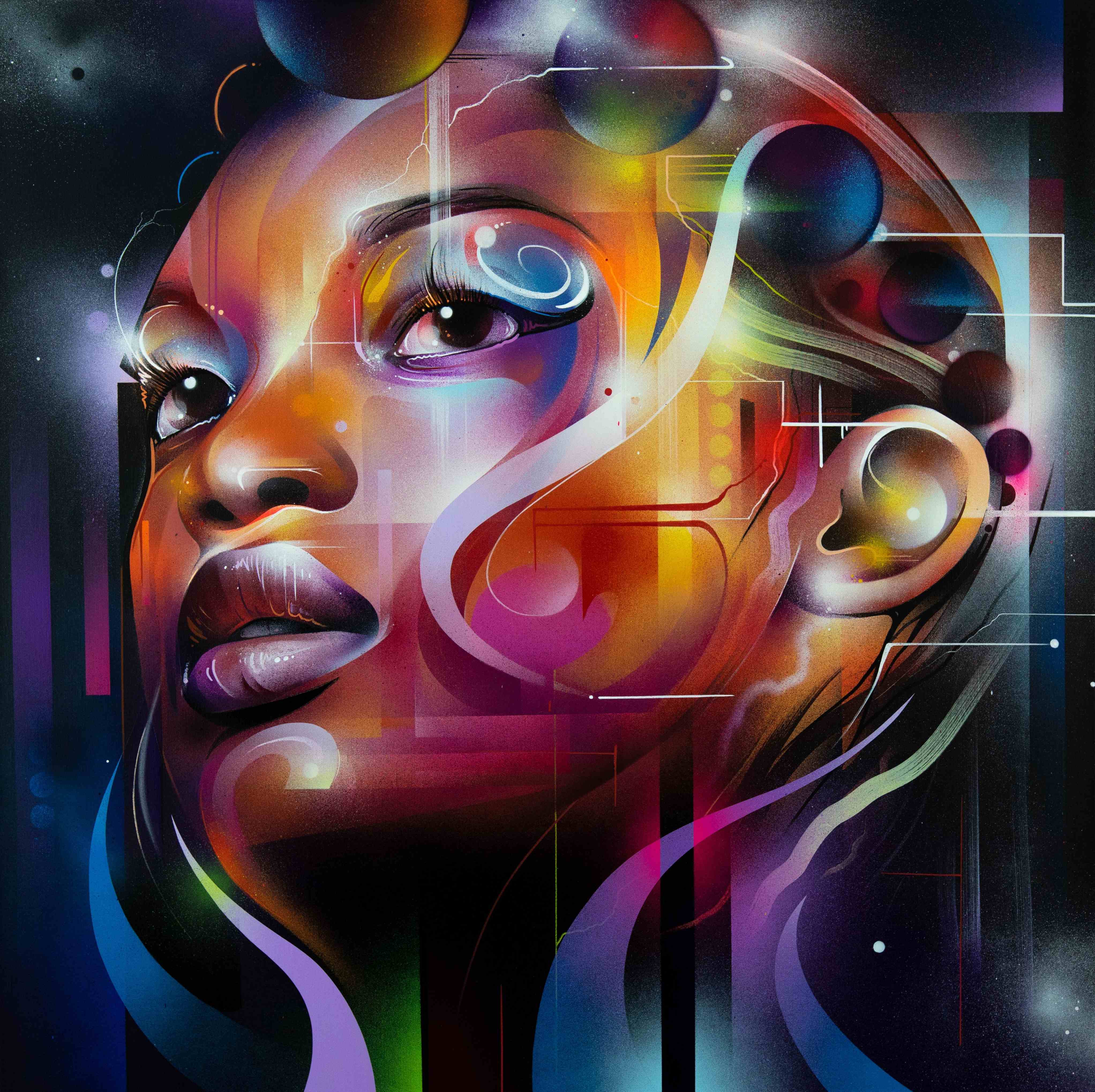 His kinetic art, described as ‘surrealist graffiti art for the soul’, is fused with funk and movement, and brings together illustration, photorealism and graffiti letterforms. His latest series marries the technical skills he’s learned over the course of his long career, and focuses on interpreting strong, spiritual women in his signature style.